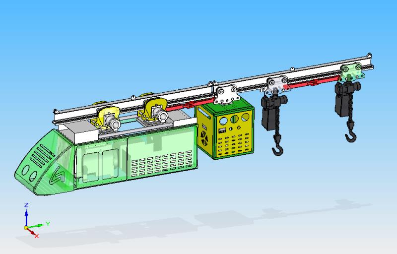 单轨吊车是用一条吊挂在巷道上空的特制工字钢作轨道,由具有各种功能的吊挂车辆连成车组,用牵引设备牵引,沿轨道运行的系统。